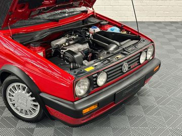 The exterior presents in classic G60 specification, retaining all original components including the dual-lamp grille, G60-specific wheel-arch and side-skirt extensions, factory fog lights, GTI and G60 badging, roof spoiler, and the correct G60 “Sebring” alloy wheels. The Tornado Red paintwork highlights the crisp, factory-correct lines of this 4/5-door GTI variant, with all trim, moldings, and exterior plastics in excellent condition—particularly rare for an unmodified G60. The car sits on a set of four brand-new tires installed during the recent service.