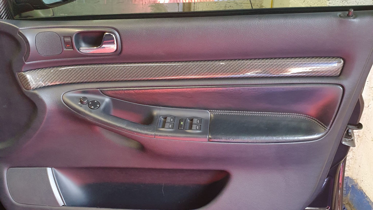 Inside, the cabin has been fitted with Recaro RS3 Wingback seats, an RS4 cluster with multi-function display, RS4 carbon trim, an Audi TTRS flat-bottom steering wheel, and an AEM boost gauge with methanol controller. A7 rear seating and a 2015 A4 rearview mirror with updated sunroof controls modernize the interior further, while factory black leather trim remains present.