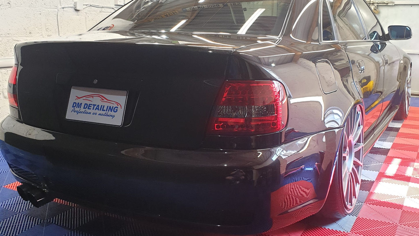 The exterior features an RS4 conversion including front and rear fenders, doors, and front bumper, along with an S4 rear bumper modified with RS4 lower trim. A US-market S4 trunk lid, Maxton front splitter skinned in carbon fiber, and Opel GTE-style carbon hood gills further distinguish the build. The Panther Black paintwork benefits from an eight-year ceramic coating, and while minor age-related blemishes are present, the finish overall is described as excellent. The car sits on OZ Racing Superturismo Dakar wheels measuring 20x10 ET26, fitted with an MG-Line center cap kit.
