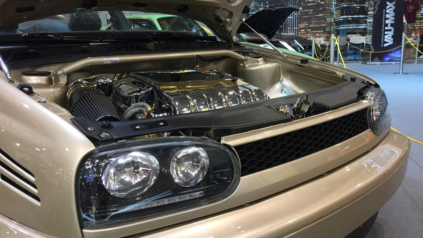Rear End Customization: Converted to Golf 4 sedan taillights with a custom-fitted, cleaned trunk lid featuring electric release, chromed and gold-plated tailgate struts, and an automatically retracting Corrado rear spoiler with chromed mechanism.
