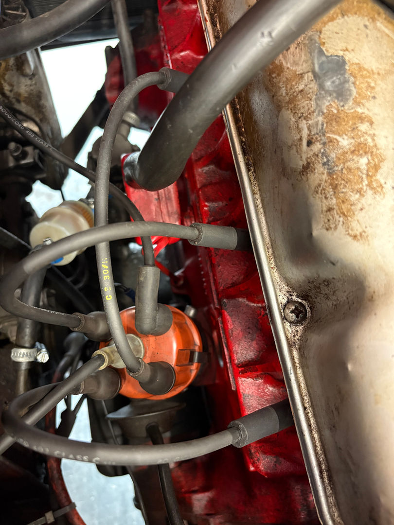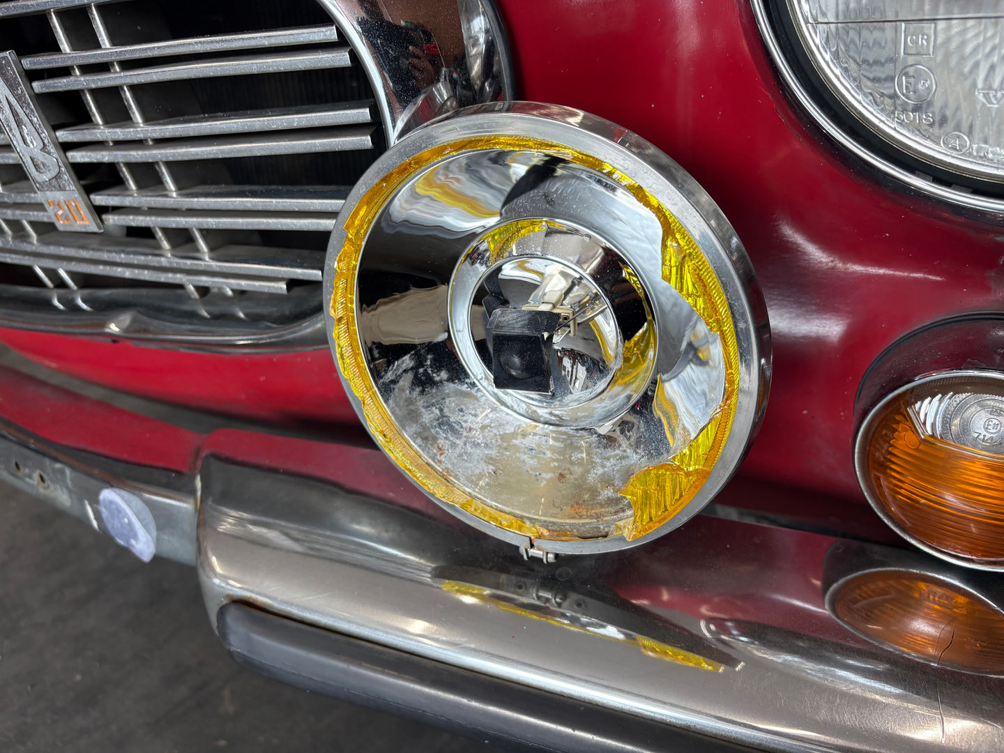 The exterior remains entirely unrestored and original, wearing its factory paint that shows patina, wear, and age-appropriate imperfections consistent with over 50 years of history. Despite its time in long-term storage, the body presents straight lines and retains the signature styling that made the P1800S an icon of 1960s European design. The red finish is complemented by bright trim, original badging, and classic steel wheels with fresh tires fitted during the recommissioning.